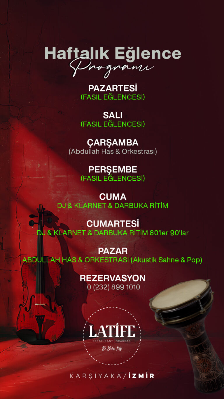 Ayrıca, hem yerli hem de yabancı misafirlerimize uygun sunduğumuz fix menü seçeneklerimizle, bütçenize uygun kaliteli bir yemek deneyimi yaşayabilirsiniz. Ailenizle, arkadaşlarınızla veya özel kutlamalarınız için ideal olan Latife Bostanlı Ocakbaşı'nda, fasıl müziğinin keyfi ve geleneksel ocakbaşı lezzetleri bir arada sizleri bekliyor